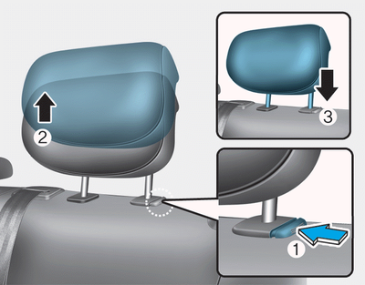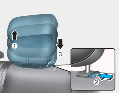 Pour monter l’appuie-tête, tirez-le vers le haut (1). Pour baisser l'appuitête, appuyez et maintenez enfoncé le bouton (2) situé à la base de l'appui- tête, puis baissez l'appui-tête (3).