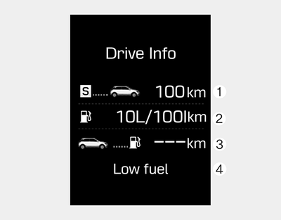 Cet écran affiche la distance parcourue (1), l'économie moyenne de carburant (2) et la distance que le véhicule peut parcourir avec le carburant restant (3).