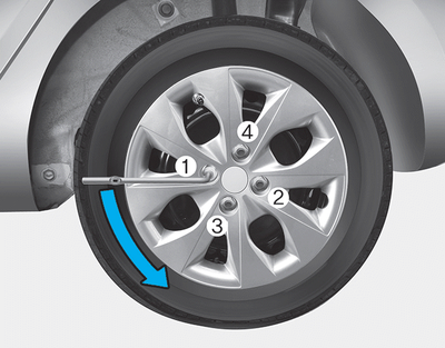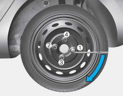 Faites le tour de vos roues er serrez chaque écrou suivant la séquence numérique indiquée dans l'image jusqu'à ce qu'ils soient tous bien serrés. Puis vérifiez à nouveau que chaque écrou est bien serré. Nous vous conseillons de faire vérifier le système par un concessionnaire HYUNDAI agréé lorsque vous changez les roues de votre véhicule.