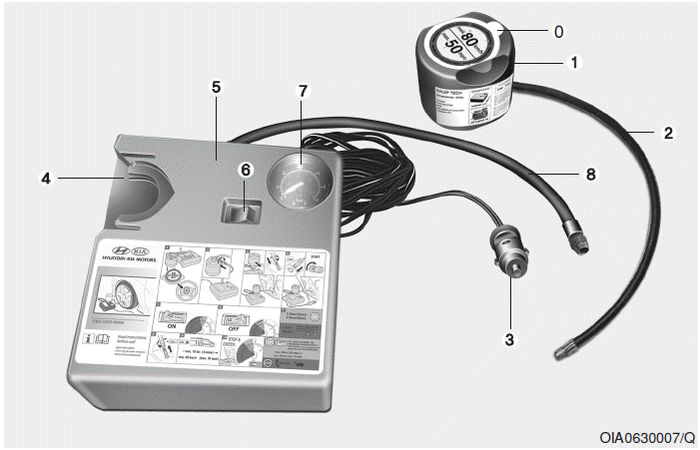 Les connecteurs, le câble et le tuyau flexible de connexion sont rangés dans le logement du compresseur prévu à cet effet.