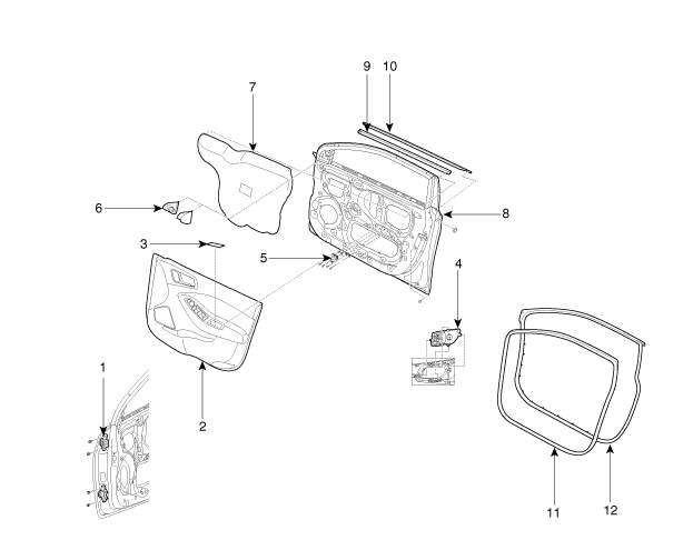 avant 8. Panneau de porte avant 9. Bande d'étanchéité intérieure du puit de la porte avant 10. Bande d'étanchéité extérieure du puit de la porte avant 11. Caoutchouc d’étanchéité latéral du corps de la porte avant 12. Caoutchouc d’étanchéité latéral de porte avant |
