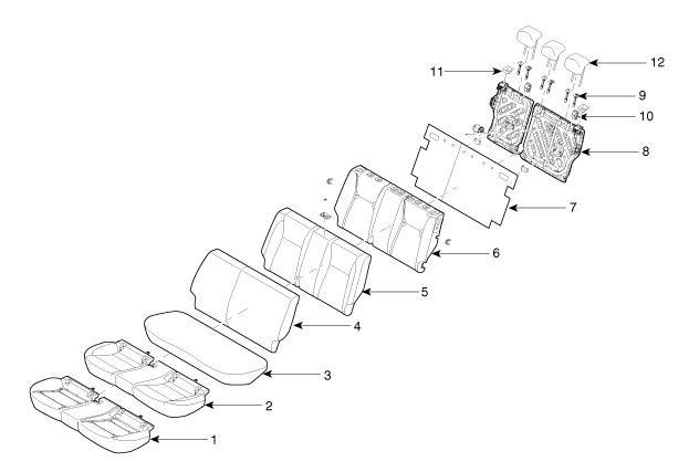 de dossier de siège arrière 8. Ensemble de l'armature du dossier de siège arrière 9. Guide d'appuie-tête de siège arrière 10. Garniture de l'ancrage 11. Cache escamotable 12. Appui-tête du siège arrière |