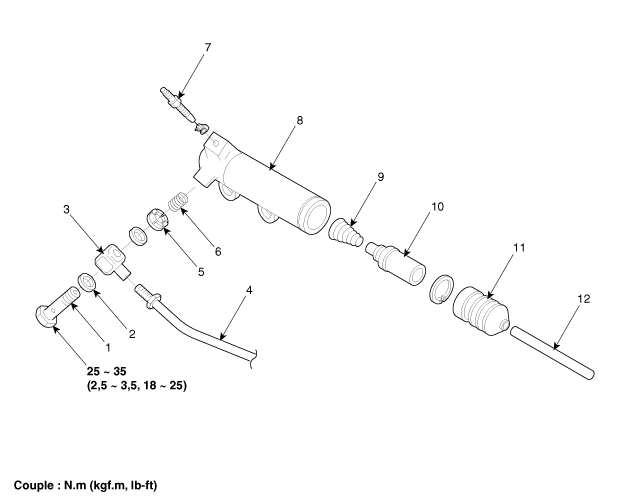 7. Vis de purge 8. Cylindre de débrayage 9. Ressort de rappel 10. Piston 11. Soufflet 12. Tige-poussoir |