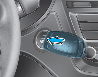 Si le niveau de charge de la batterie smartkey est faible ou que la clé intelligente ne fonctionne pas correctement, vous pouvez démarrer le moteur en appuyant sur le bouton de Démarrage/Arrêt du Moteur avec la clé intelligente dans l'illustration cidessus.