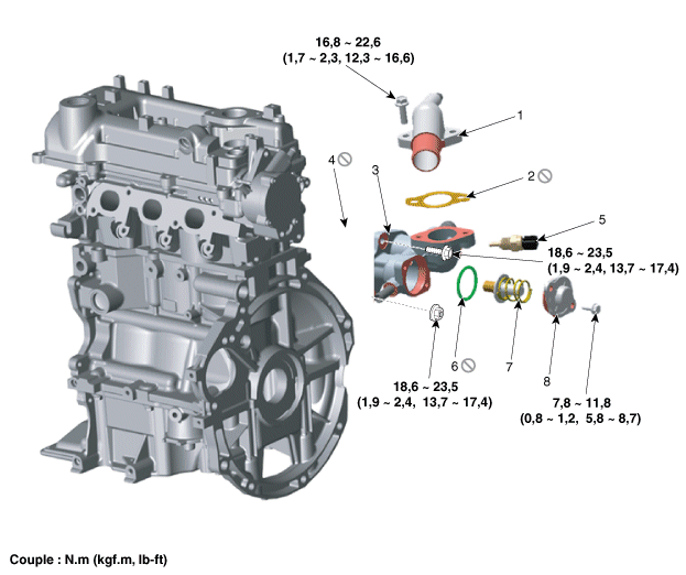 liquide de refroidissement du moteur 6. Joint torique bouchon du thermostat 7. Thermostat 8. Bouchon du thermostat |