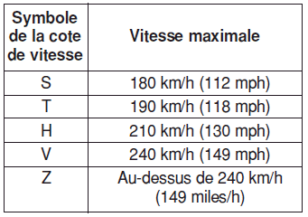Le tableau ci-dessous répertorie les différentes cotes de vitesse utilisées par les pneus de véhicules de tourisme. La cote de vitesse est indiquée dans la désignation de dimension du pneu figurant sur le flanc du pneu. Ce symbole correspond à la vitesse de conception maximale de ce pneu.