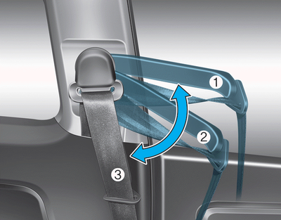 3. Après être entré ou sorti, glissez le siège vers l’arrière en tenant le coussin du siège, puis poussez le dossier du siège vers l’arrière. De plus, réglez le guide d'extension de la ceinture à la position (1) ou (2).