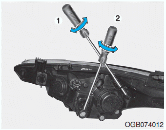 5. Pour orienter les feux de croisement (et feux de route) vers la gauche ou vers la droite, tournez le tournevis (2) dans le sens horaire ou antihoraire. Pour orienter les feux de croisement (et feux de route) vers le haut ou vers le bas, tournez le tournevis (1) dans le sens horaire ou antihoraire.
