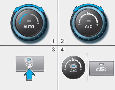 Si la climatisation, la position air extérieur (frais) et la vitesse maximale du ventilateur ne sont pas sélectionnées automatiquement, réglez le bouton ou la molette correspondants à la main.