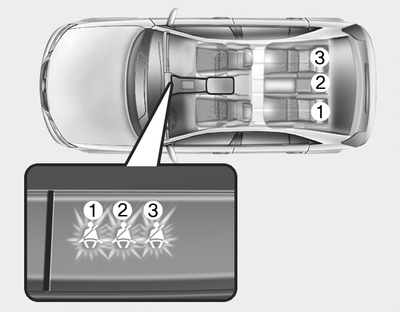 Si le contact est mis (moteur arrêté) alors que la ceinture du passager arrière n’est pas bouclée, le témoin d’avertissement correspondant s’allume jusqu’à ce que la ceinture soit bouclée.