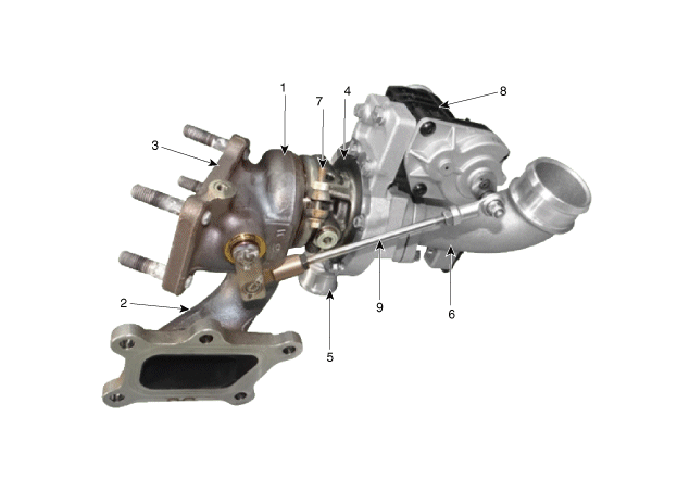 6. Sortie du compresseur 7. Carter central 8. EWGA (Activateur de la valve "wastegate" électrique) 9. Tige d'actionneur |
