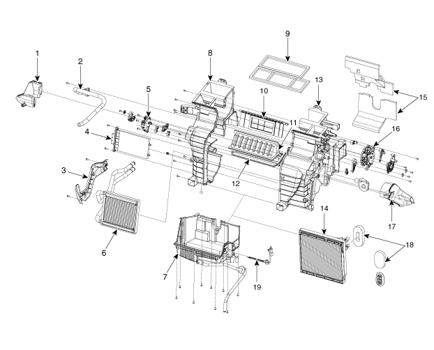 8. Carter de chauffe [G] 9. Joint d’étanchéité de conduit 10. Volet d’évent 11. Ensemble de la porte avant 12. Ensemble de volet de température 13. Carter de chauffe [D] 14. Ensemble de noyau d'évaporateur |